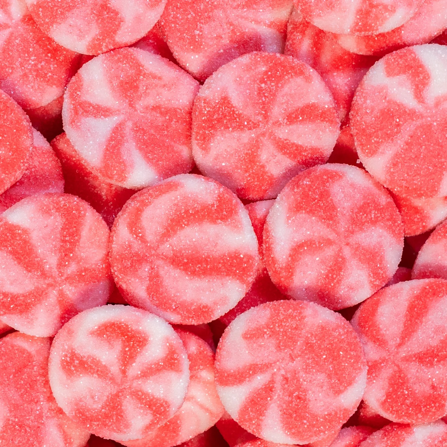 Savourez les délicieux bonbons spirale fraise crémeux et sucrés . Halal, en forme de cercles roses et blanches, une tentation irrésistible !