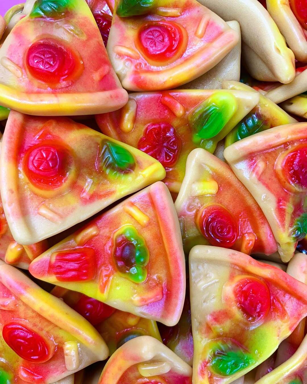 Sirop de glucose, eau, sucre, gélatine de boeuf, amidon modifié de pomme de terre, cidifiants : E330, E170, agents d’enrobage : huile végétale (palme), E901, E903, arôme, colorants : E150c, E102, E129, E133. Sans gluten.